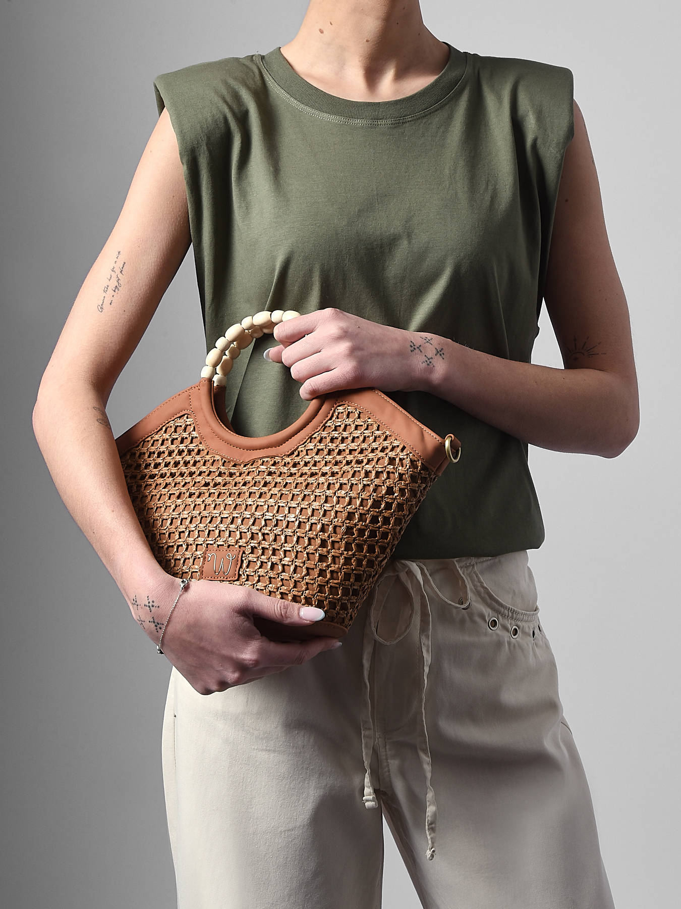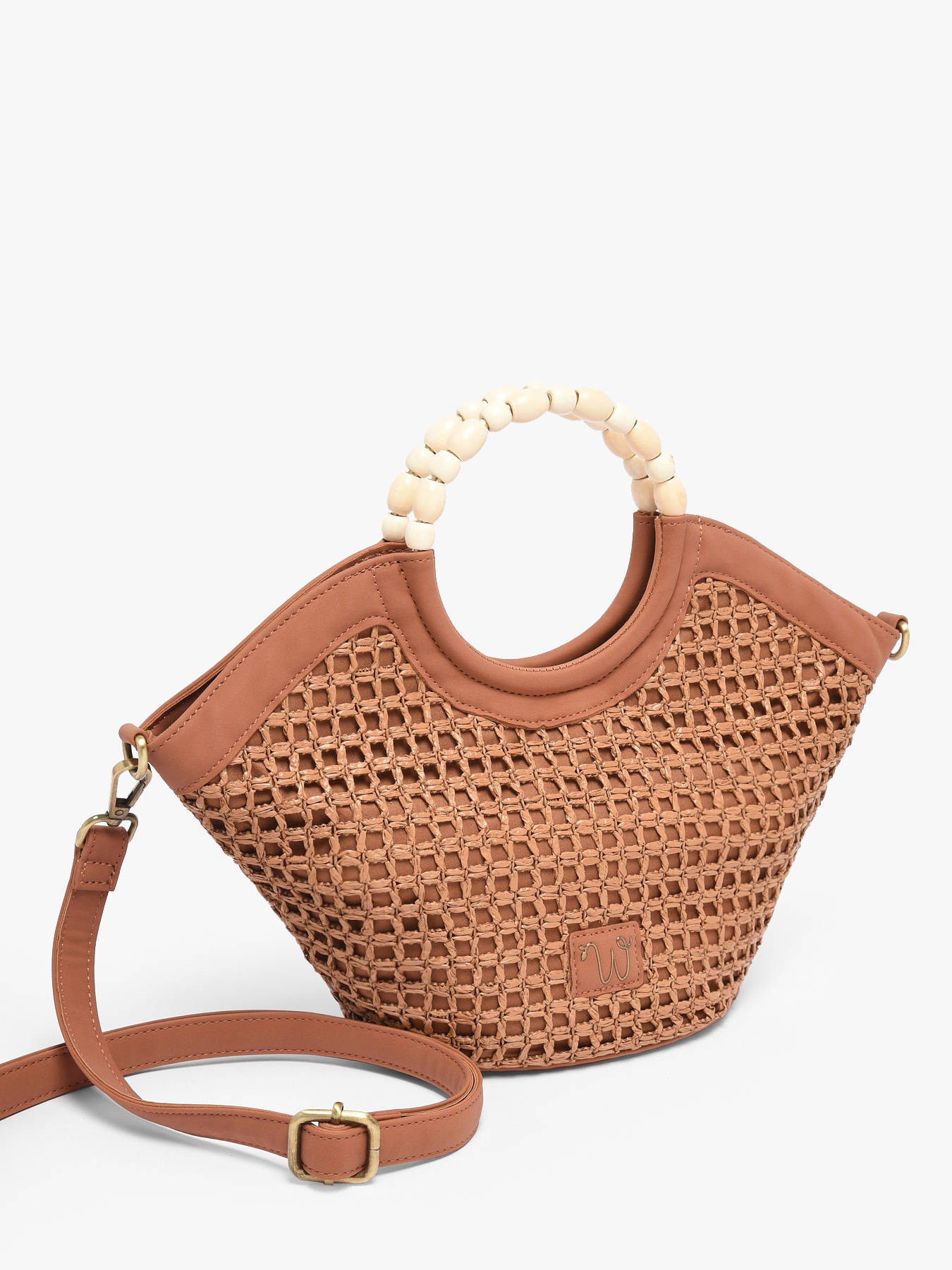 Le sac bandoulière WOOMEN petit format de la ligne Neflier Estival allie élégance, praticité et esprit estival. Sa matière principale en polypropylène garnie de polyuréthane recyclé, associée à la doublure en coton et lin, assure solidité et légèreté. Les finitions précieuses et la poignée recouverte de perles apportent originalité et raffinement au modèle. Ce sac bi-matière dispose d’une fermeture zippée et d’une bandoulière amovible en polyuréthane pour un porté modulable selon vos envies. Le logo en résine doré complète le design, faisant de ce sac un accessoire fonctionnel et stylé, parfait pour compléter vos tenues estivales.